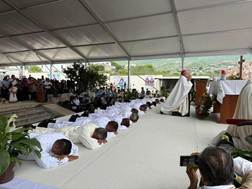 “La ordenación de los diáconos la teníamos programada en el día de los Diáconos, cuando los diáconos celebran su jubileo, el Jubileo de los diáconos a nivel internacional. Pero quisimos que mejor se pasara a esta fecha, a este día especial, y miren, estamos regalándole al corazón inmaculado de María 14 servidores, 14 diáconos, porque eso significa diáconos, servidores, servidores de un amor materno.