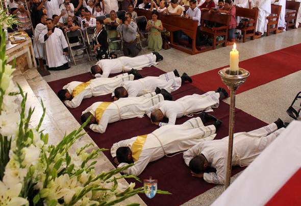 Posteriormente, se postraron en el altar para realizar el canto de la Letanía de los Santos y, al término, recibieron la imposición de manos y consagrados los Diáconos y Sacerdotes por el Obispo Diocesano.