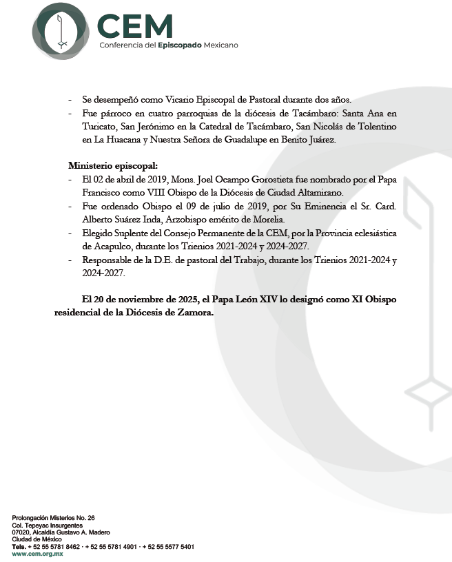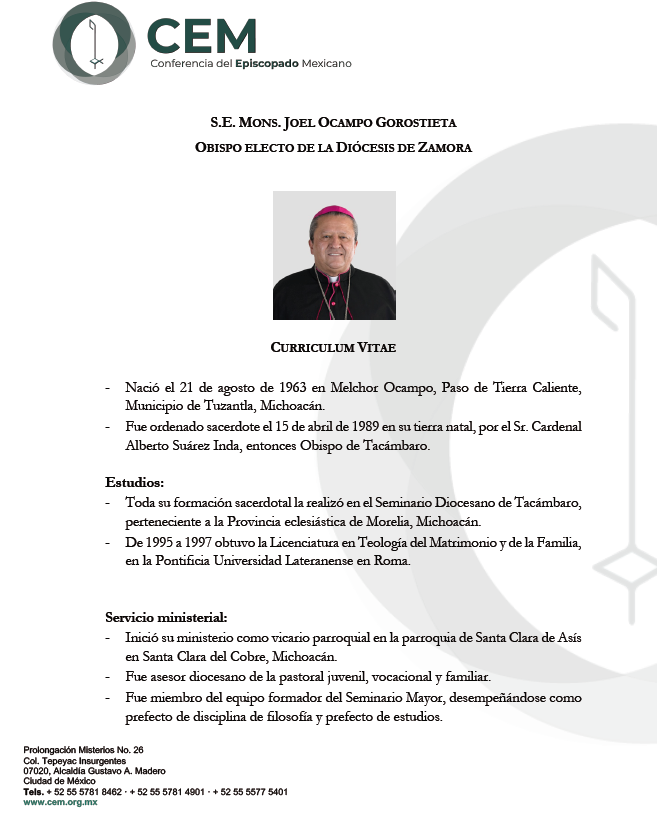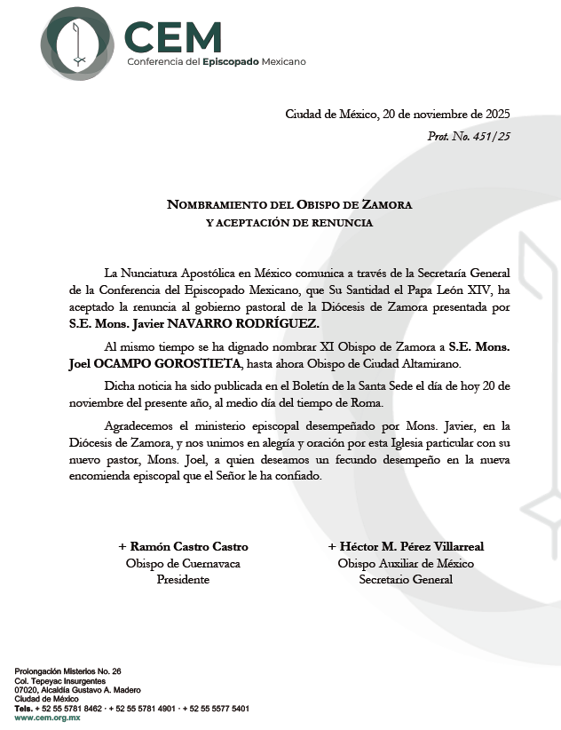 La Nunciatura Apostólica comunica, a través de la Secretaría General de la Conferencia del Episcopado Mexicano, que Su Santidad León XIV se ha dignado nombrar XI Obispo de la Diócesis de Zamora, a S.E. Mons. Joel Ocampo Gorostieta, hasta ahora Obispo de Ciudad Altamirano. Nos unimos en alegría y oración con la Iglesia que peregrina en la Diócesis de Zamora y deseamos un fecundo desempeño en su nueva encomienda episcopal que el Señor le ha confiado.
