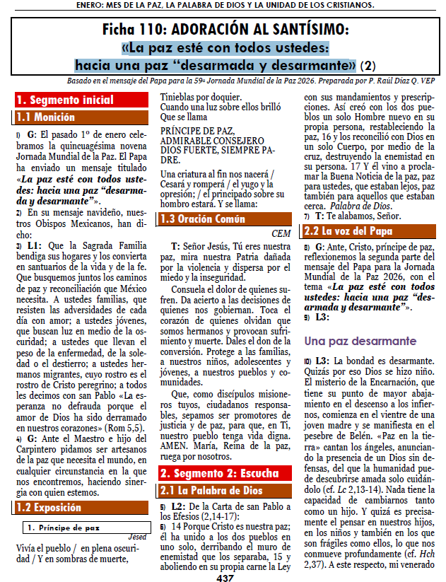 Ponemos a su disposición dos esquemas para la Hora Santa del próximo día Jueves 08 de Enero de 2026. en torno a la ADORACIÓN AL SANTÍSIMO – «La paz esté con todos ustedes: hacia una paz “desarmada y desarmante»